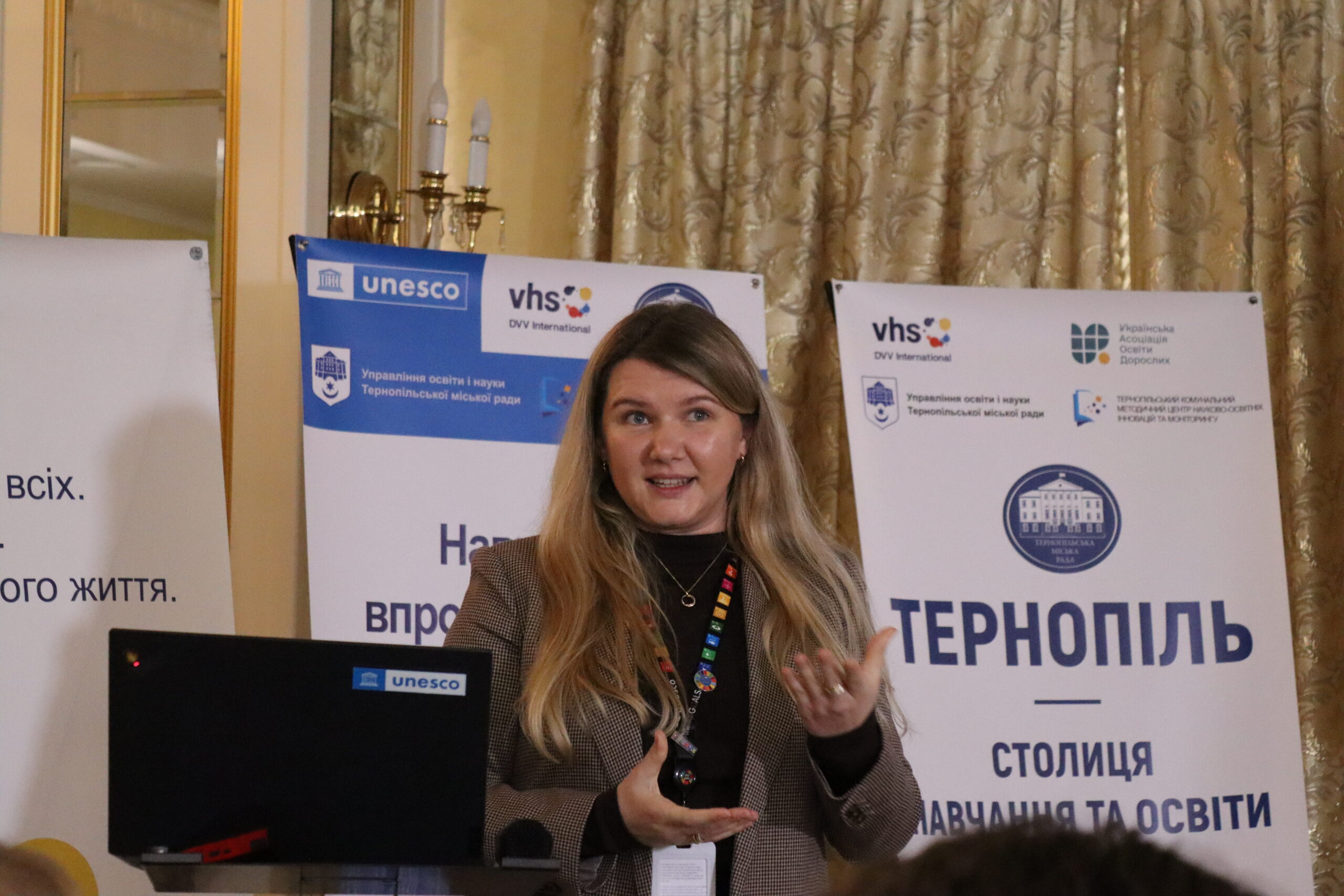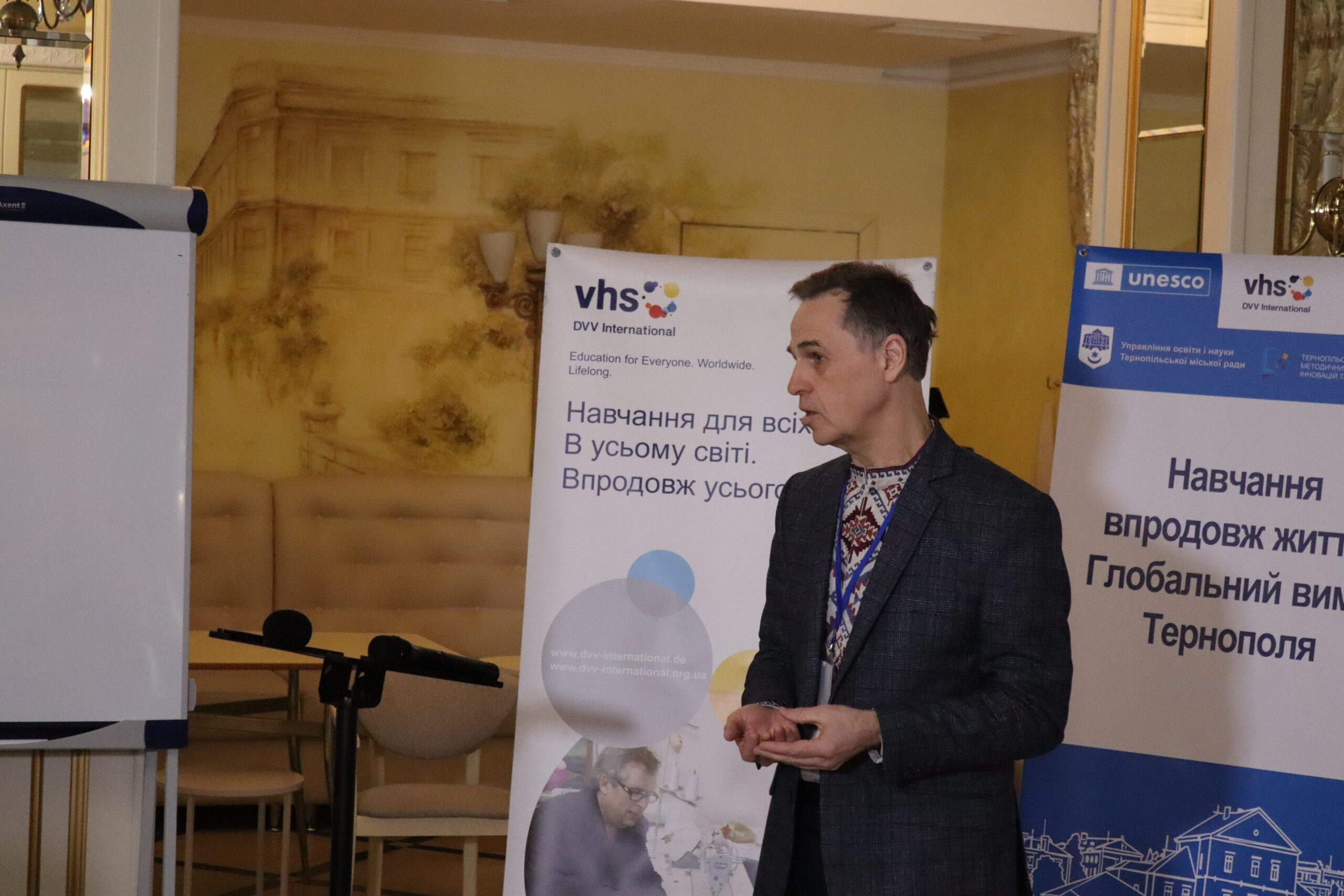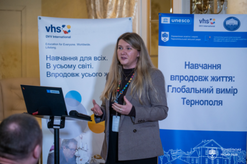 Welcoming remarks were delivered by Acting Mayor of Ternopil Ihor Hirchak; Member of the Verkhovna Rada Committee on Education, Science and Innovation Yaroslavа Levchenko; First Secretary of the National Commission of Ukraine for UNESCO Nina Kramareva; Education Specialist at the UNESCO Office in Ukraine Alyona Popova; DVV International representative in Ukraine Oleh Smirnov; and Head of the Ternopil City Council Education Department Olha Pokhyliak.
