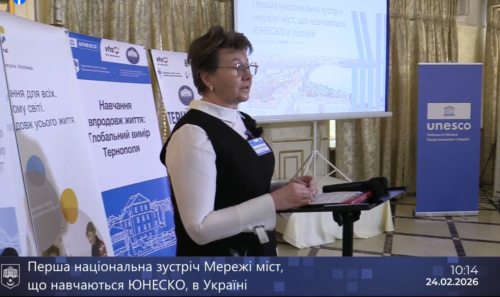 Альона Попова привітала присутніх від імені Представництва ЮНЕСКО в Україні та подякувала Тернопільській міській раді й управлінню освіти і науки ТМР за організацію та можливість проведення Першої національної зустрічі Мережі міст, що навчаються ЮНЕСКО, в Україні саме в Тернополі.